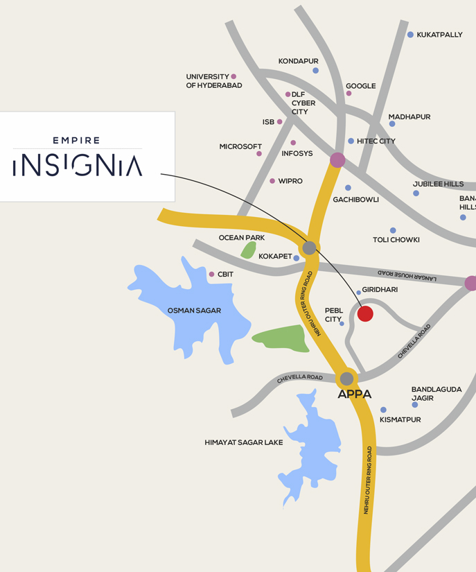 Empire Insignia is the closest villa project to the APPA Junction Exit – one of the most desirable residential locations in Hyderabad and a lifestyle address for young and established professionals. When Insignia is your home, everything you need is within easy